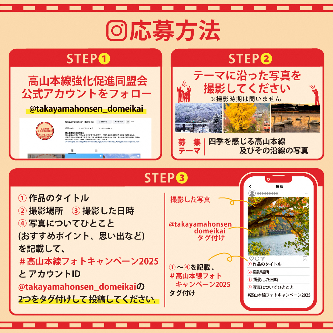 JR高山本線の沿線自治体、商工会等で構成する高山本線強化促進同盟会では、高山本線の魅力を広く発信するため、昨年ご好評いただいた「高山本線フォトキャンペーン」を今年も開催します。