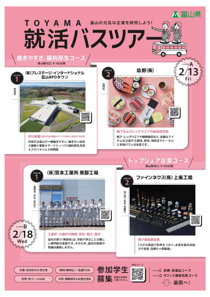 2月13日(金)~2月20日(金)のうち計4日間、県内企業を半日で2社巡る「TOYAMA就活バスツアー」を実施いたします!