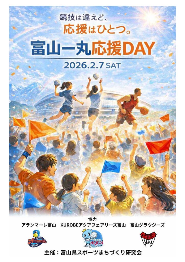 富山県スポーツまちづくり研究会(事務局:富山県富山市)は、富山県立大学と連携し、2026年2月7日(土)に県内各地でホームゲームを開催するプロ・トップスポーツ3クラブと協力し、競技の垣根を越えて地域を盛り上げるプロジェクト「TOYAMA一丸応援DAY」を実施いたします。