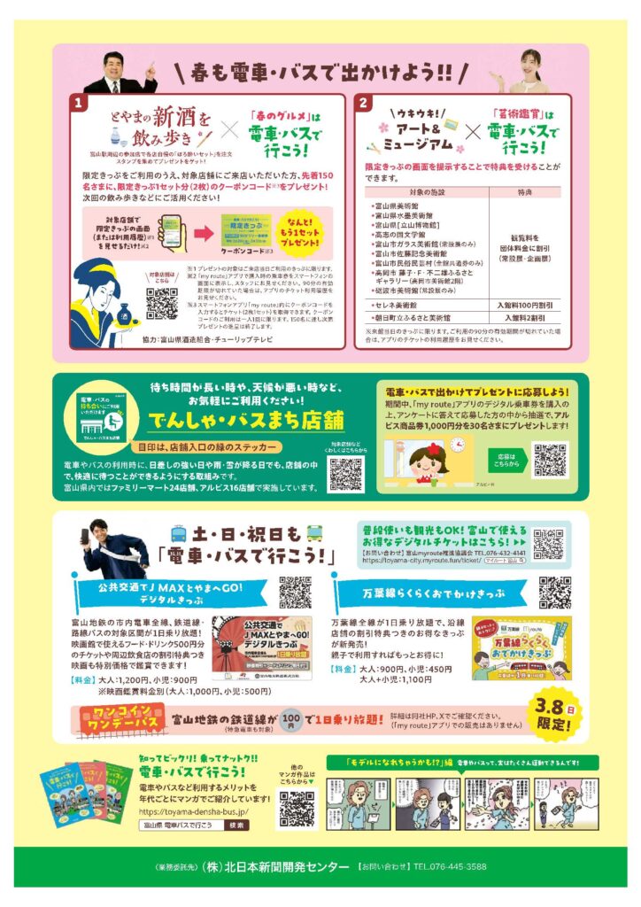 あいの風とやま鉄道や富山地方鉄道など県内の公共交通機関(電車やバス、路面電車)が平日の90分間、150円で乗り降り自由となるキャンペーン限定きっぷを、スマートフォンアプリ「my route」上で2枚セット300円で販売します。