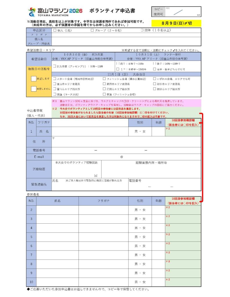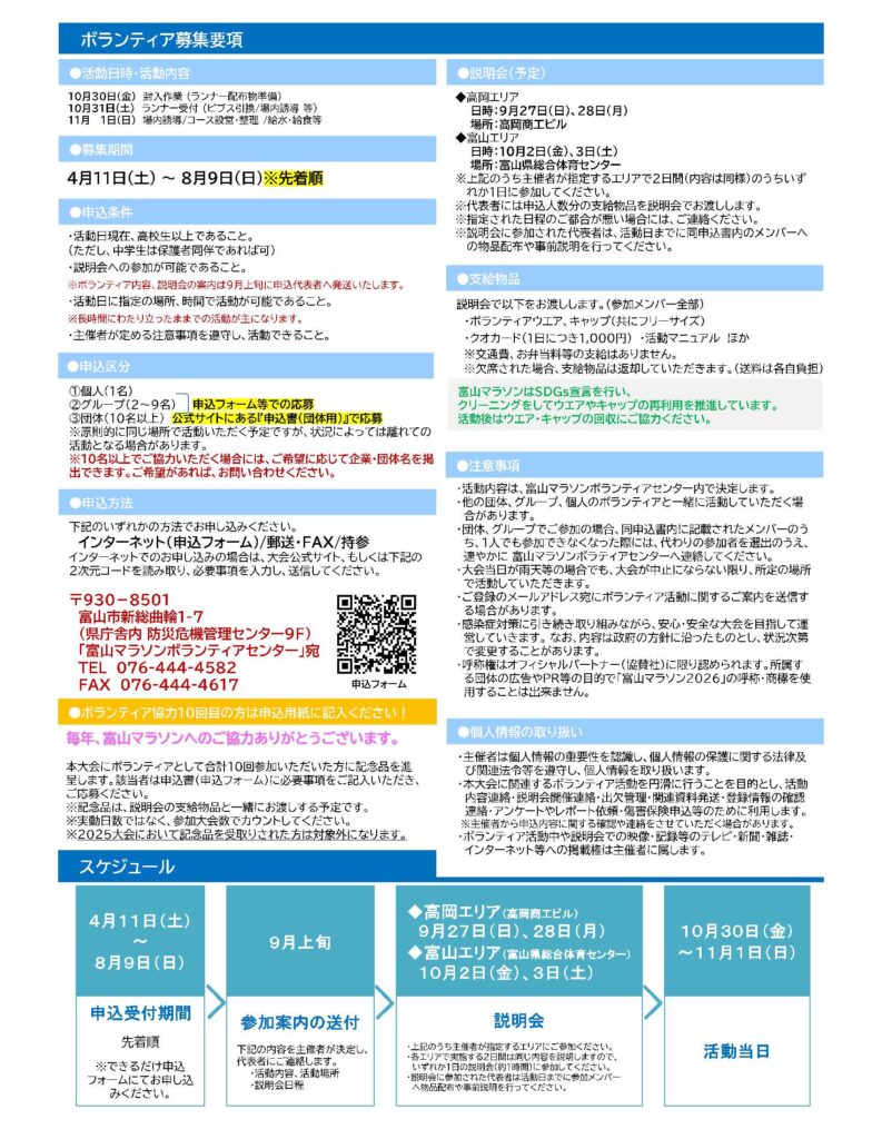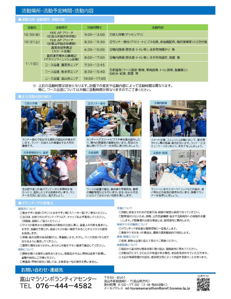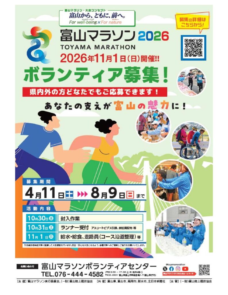 問合せ先:富山マラソンボランティアセンター (富山マラソン実行委員会事務局内)