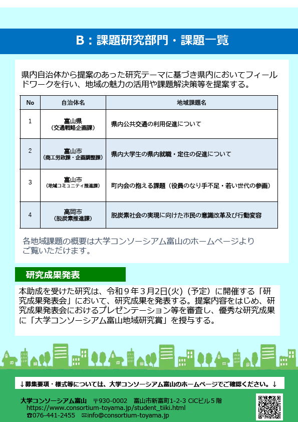 | 1 | 若者に選ばれるまちづくりへの提案 地域調査を通じた氷見市の魅力発見と発信・交流 | 氷見市全域 | 富山大学 |