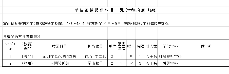 | 休講・補講等の連絡 | ・学生玄関 専攻科掲示板 (注)講義当日に休講の連絡があった場合は、所属大学等に連絡できない場合があります。 |