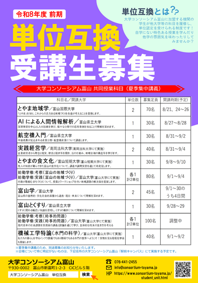 | 問合せ先 | 学務部学務課 〒930-8555 富山市五福3190 TEL:076-445-6078 E-mail:g-kikaku@adm.u-toyama.ac.jp |