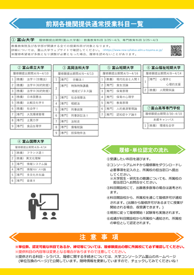 | 休講・補講等の連絡 | 本学のスマホアプリで確認してください。 (スマホアプリ)https://www.u-toyama.ac.jp/studentsupport/tomidai-apps/ こちらからダウンロードしてください。 なお、教養教育科目は五福キャンパス共通教育棟A棟1階、専門教育科目は各学部掲示板にも掲示しています。 |