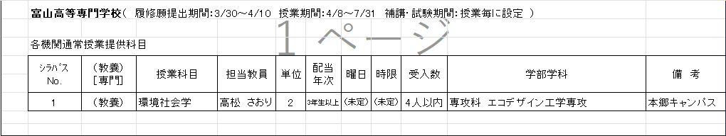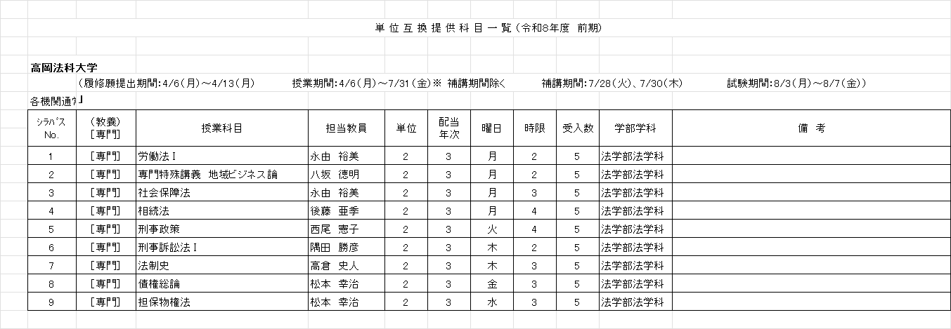 | 問合せ先 | 教務課 〒939-1193 高岡市戸出石代307-3 TEL:0766-63-3388 E-mail:kyomu@takaoka.ac.jp |